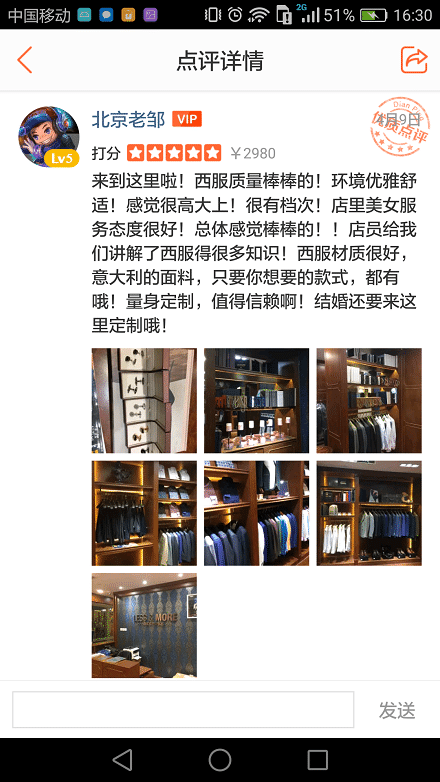 來到這里啦!西服質量棒棒的!環(huán)境優(yōu)雅舒適!感覺很高大上!很有檔次!店里的美女服裝顧問服務態(tài)度很好!總體感覺棒棒的!!店員給我們講解了西服定制得很多知識!西服材質很好,意大利的面料,只要你想要的款式,都有哦!量身定制,值得信賴啊!結婚還要來這里定制哦!